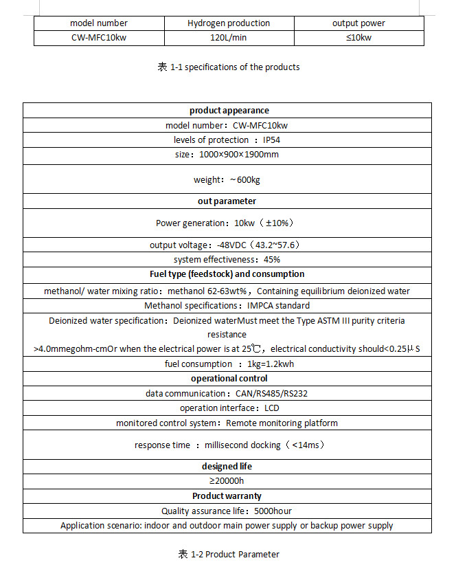 CW-MFC10kW is a methanol water hydrogen fuel cell generator with a power of 10kW. Using the methanol reforming hydrogen production technology and the fuel cell power generation technology integration, the full closed-loo