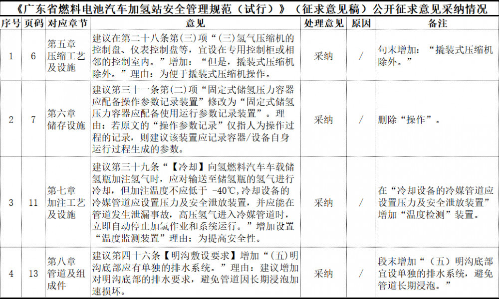 Announcement points out that, to standardize the fuel cell vehicle hydrogenation station construction operation management, to ensure safe operation, power hydrogen and fuel cell vehicle industry healthy and rapid development, live build the hall organization compiled the Guangdong province fuel cell vehicle hydrogenation station safety management specification (try out) " (draft), and on March 10,2023 solstice March 24,2023 to the public opinion. As of March 24,2023, the Housing Department has received four comments, as follows: