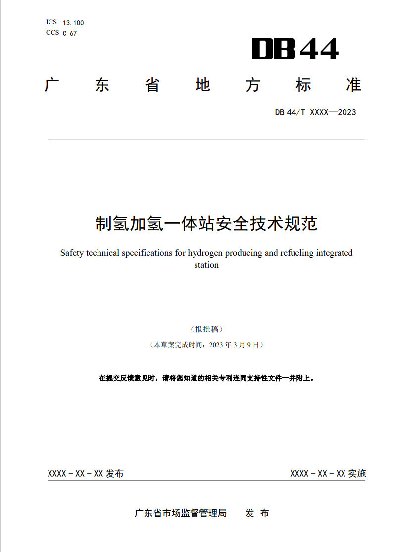 On May 6, the Guangdong Provincial Department of Emergency Management issued a notice on soliciting opinions on the local standards of the Safety Technical Specifications for Hydrogen Production and hydrogenation Stations (draft for approval).